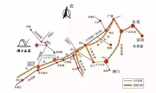 珠海由江珠高速转中江高速(江门方向;中山、江门由此进入)直行至共和收费站。在共和收费站转佛开高速(开平、湛江方向)、开阳高速,在开阳高速圣堂出口下,约200米右转朗底方向,约18分钟即到。
